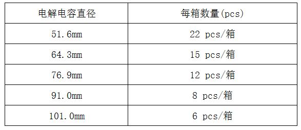 根據(jù)電解電容直徑的不同,CECTN電容每箱包裝數(shù)量分為下表中六種: