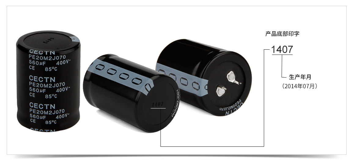 牛角型電解電容底部印字信息為4位數組成,代表著該產品的生產年月,上圖所示的1412即表示該產品為2014年12月所生產。