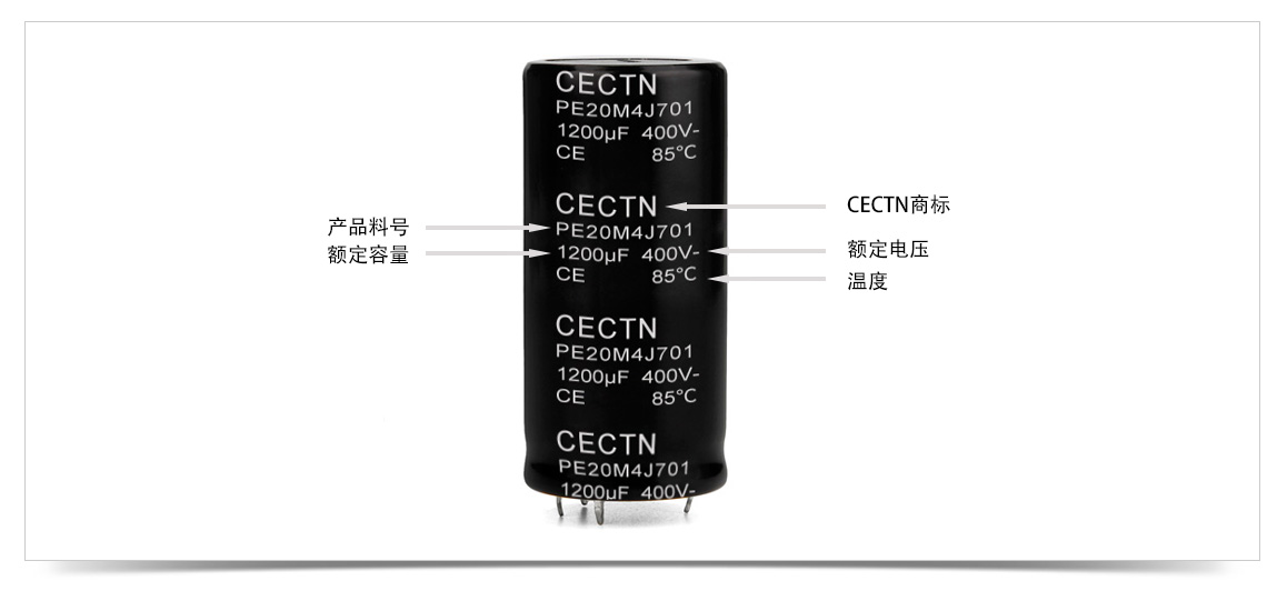 CECTN電解電容印字信息中包含了牛角型電解電容的電壓、容量、溫度、壽命、焊針數量型號等眾多信息,詳細了解請點擊進入《牛角型電解電容料號說明》頁面。