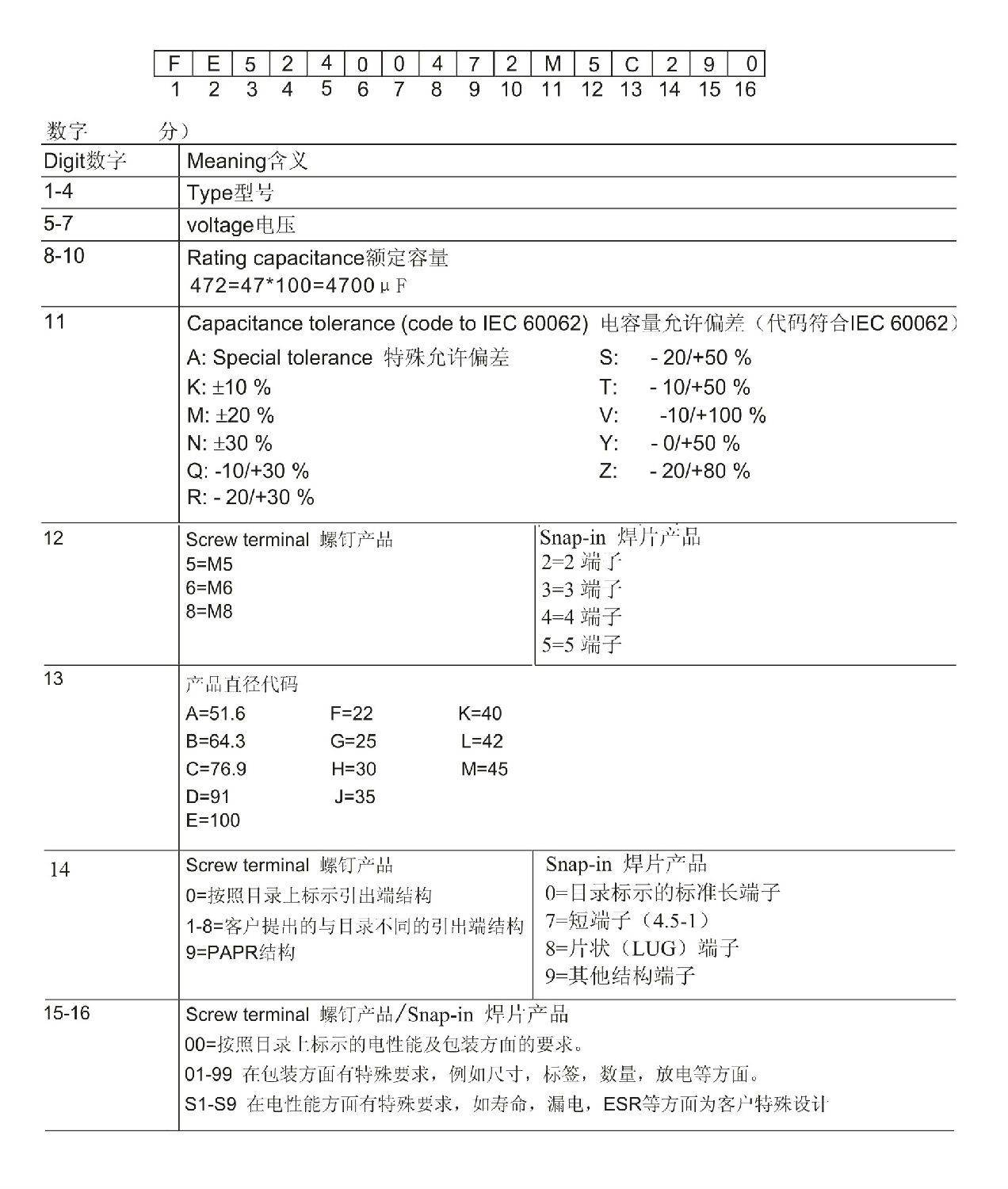M5C290其中M代表產品容量偏差范圍(A:特殊允許偏差,K:±10%,M:±20%),“5”代表產品端子螺紋為M5(一般有M5,M6,M8三種),“C”代表產品直徑為76.9mm(A:51.6mm,B:64.3mm,C:76.9mm,D:91.0mm,E:101mm),“2”代表產品端子結構(端子直徑有0:17.7mm,1:13.4mm,2:10mm),“90”代表客戶提出的電性能與包裝等方面的要求。